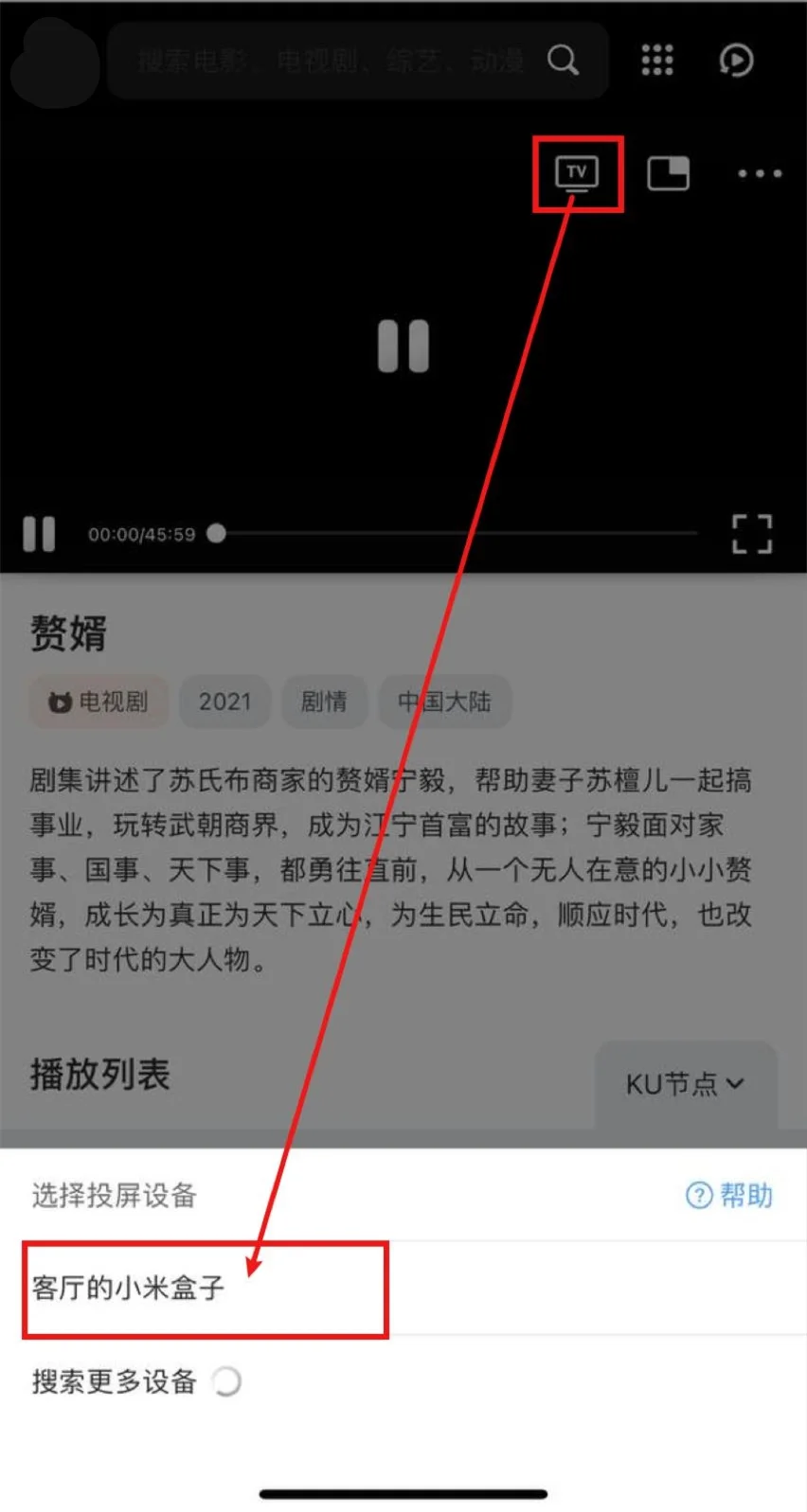 打开夸克浏览器->打开铭宇影视->播放视频->选择·····右上角 … ->投屏->等待搜寻出智能电视/电视盒子->选中,即可投屏。